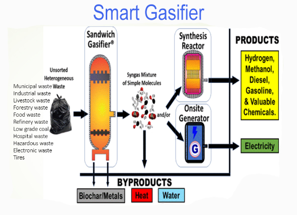 Smart Waste Converters use a Sandwich Gasifier to vaporize complex waste materials into